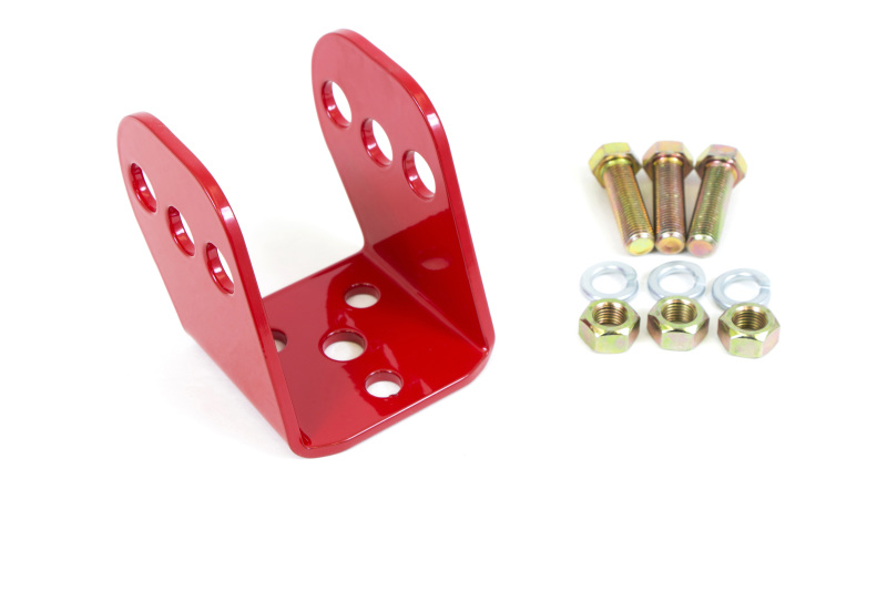 This new replacement rear control arm mount replaces the stock control arm mount that attaches the rear upper control arm to the vehicle chassis. This item works excellent when the factory mount is too rusted to re-use or when installing a 12-bolt 4-link set-up into a 3-link equipped vehicle. Replacement bracket is CNC machined from 0.188” thick steel plate, precision bent and supplied with a bright red or gloss black powder coat. Item includes new grade 8 hardware to complete installation. This mount also features instant center adjustment by lowering or raising the upper control arm. The center hole supplied in the bracket represents the factory location.