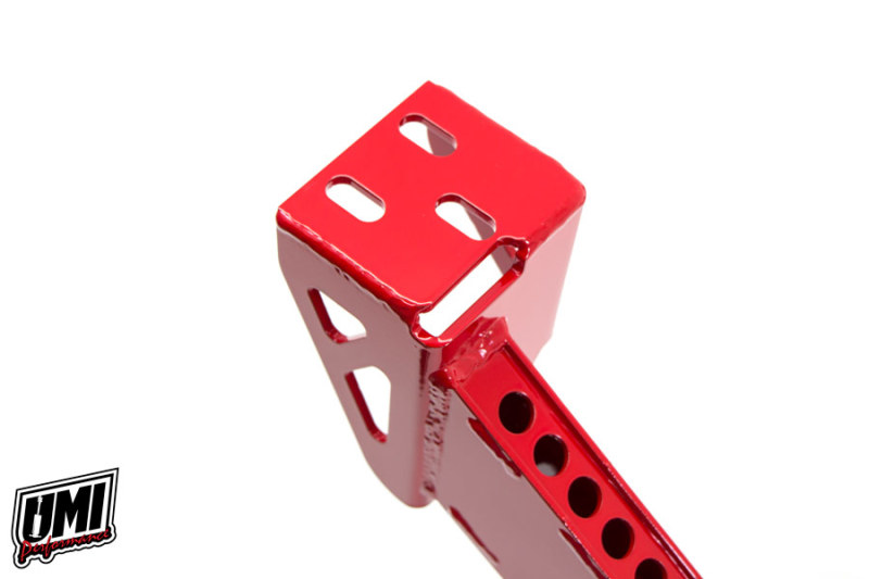 The UMI Watts Link is designed as a key component to optimize the 3rd and 4th Gen F-car solid axle rear suspension. The combination of lateral locating ability and roll center height adjustment makes a Watts Link the best choice for axle location in handling cars. UMI’s premium P/N 2080 features a unique construction which is laser cut for accuracy and boxed for awesome strength vs weight. The propeller is designed with bulletproof Delrin bushings and a castle nut/cotter pin arrangement to ensure reliability and long service life. The locking design eliminates the need for over-tightening which ensures safety combined with smooth propeller movement. UMI-built aluminum sleeves allow for on-car lateral location adjustment while the bracket system holds the other end securely. The slotted design makes for easy parallelism adjustment and ensures smooth travel throughout the 2.5” adjustment range. Exhaust clearance is a major design consideration in the UMI 2080 and it has increased clearance over competitors designs. This will clear most large single over-the-axle systems as well as many dual pipe systems. The UMI P/N 2080 is built entirely in-house and always of USA materials. Raced with pride on the UMI Performance ’99 Camaro.