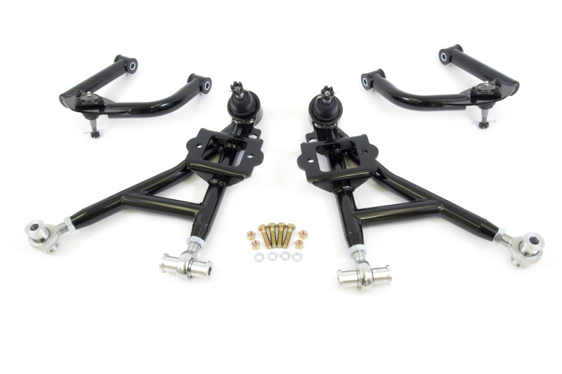 UMI’s fabricated tubular a-arms provide a rock solid foundation for your 4th Gen’s front suspension. Our a-arm kit is built to offer increased rigidity, smooth travel, a precise steering feel, and an 8lb weight savings over stock. This kit features a combination of our race lower a-arms and street upper a-arms, makes for a great drag race oriented a-arm kit that is easy on the wallet. The DOM 1-1/4” diameter tubular sections are precision bent, CNC notched and welded in a jig to form the solid base. In-house built 4130 CrMo tube adapters on the lower a-arms provide a durable attachment point for the premium Teflon lined race quality rod ends. The strong fabricated upper a-arms use street friendly greasebale polyurethane bushings. The spring and shock attach to the lower arm via a tough 1/4” thick steel shock mount. The CNC machined lower ball joint cup and CNC laser cut upper pad feature premium ball joints installed. UMI’s tubular lower a-arms can be installed on the factory k-member or any aftermarket k-member as well as the stock spindle - making this a true bolt-on product. Manufactured with pride in Philipsburg, PA – USA