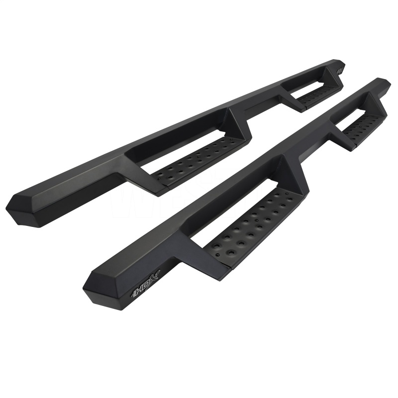 Westins HDX Drop Nerf Step Bars provide the rugged look and function that truck owners need and want. They feature a solid 1-piece steel construction and heavy duty punch plates creating high traction step areas. The HDX Drop Nerf Step Bars also feature Westins notched bar design which provides more than 2in. of additional toe/heel placement versus competitive brands. Available in a textured black finish that complements Westin HDX Bumpers. The HDX Drop Steps have vehicle specific applications and include a vehicle specific mount kit, installation hardware and instructions.