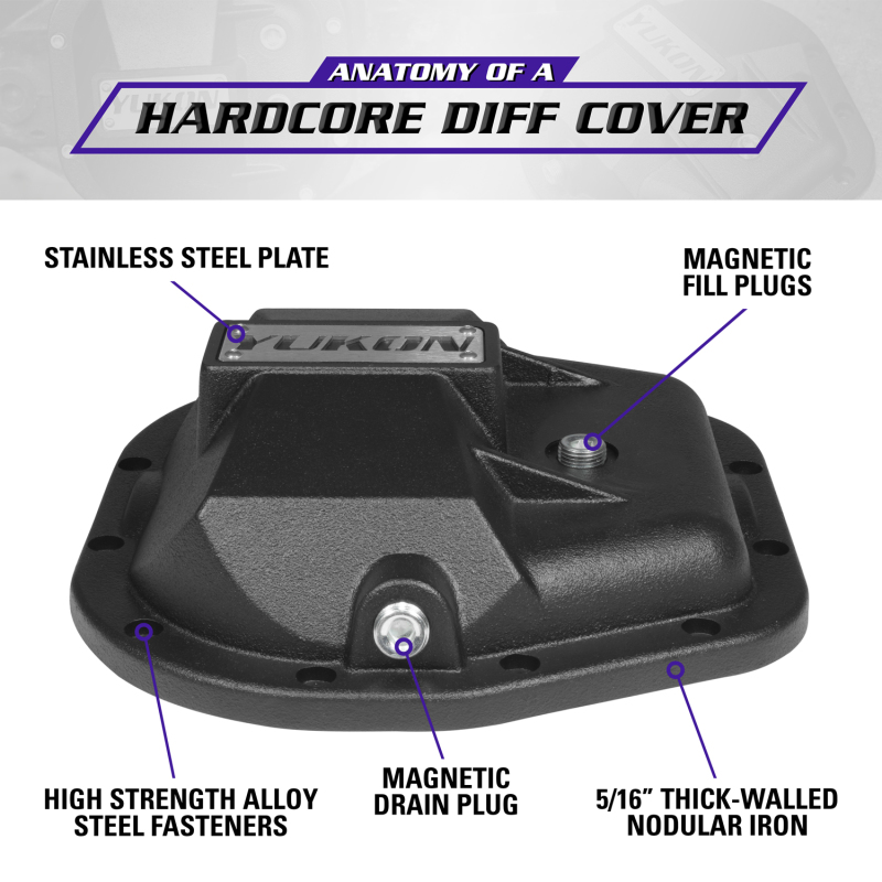 Yukon Hardcore Diff Covers are constructed from thick-walled, high-strength nodular steel to protect lockers, gears and axles from the most extreme hits in off road driving. They also increase the structural rigidity of the differential, reducing deflection under high-torque situations that can put severe loads on vital internal parts. Yukon Hardcore Diff Covers feature a durable powder coat finish and high strength steel fasteners for easy bolt-on installation. It’s no secret that the underside of your rig can take a beating. Remember your diff! It’s the lowest hanging fruit and very susceptible to damage… crack or break it and you’re done for the day. Upgrade to a Yukon Hardcore Diff Cover and enjoy more peace of mind on the trail.